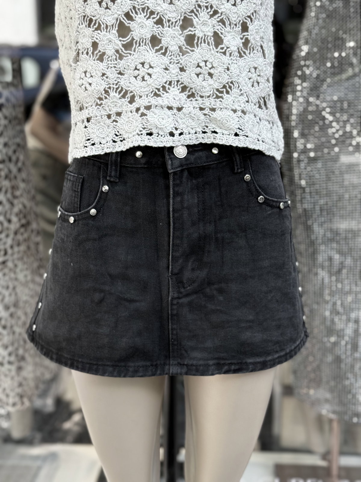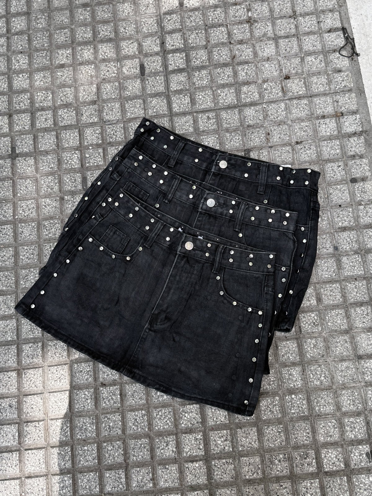 Mini pollera, de jean negro. Con detalles de tachas. Importado