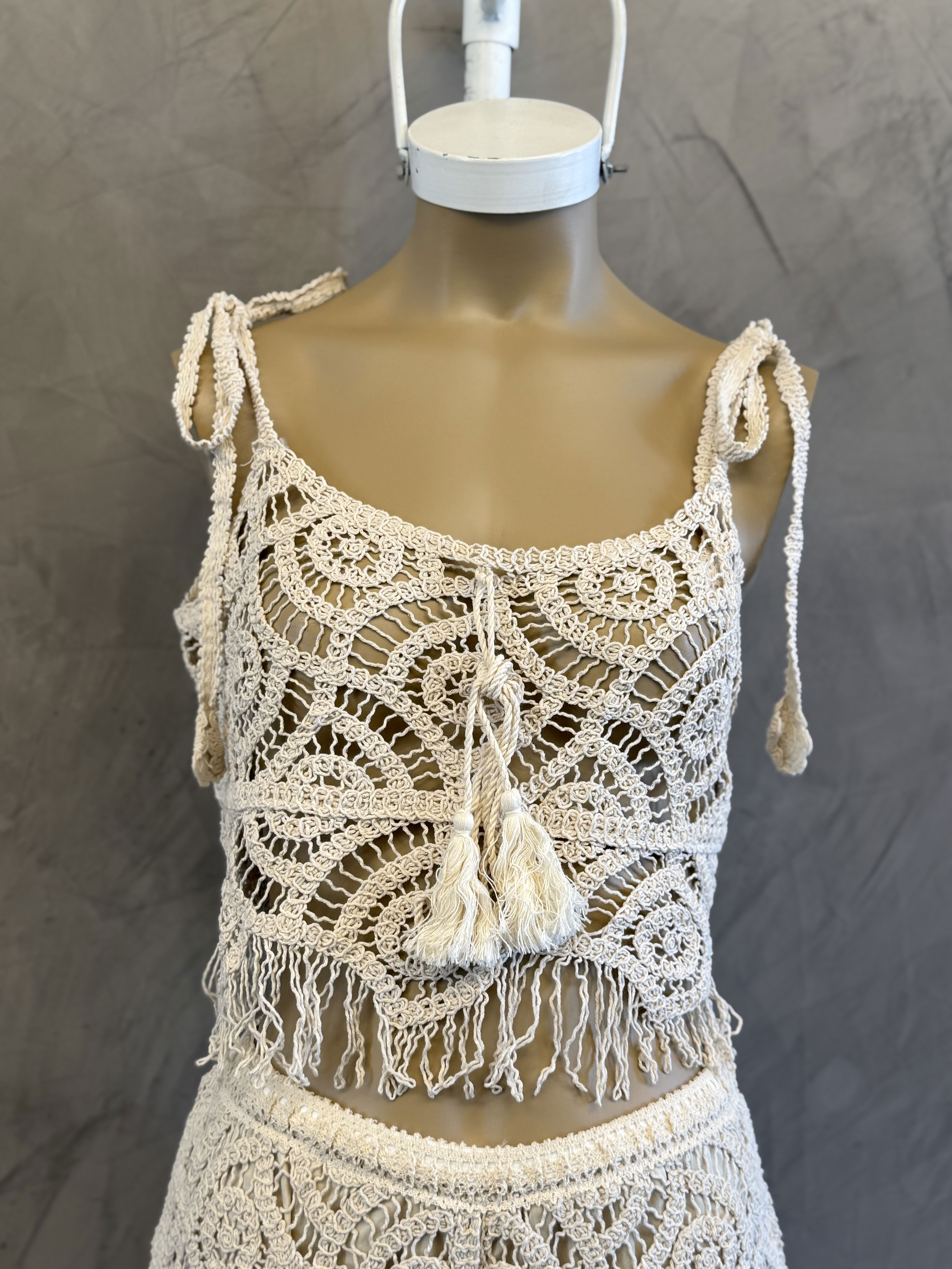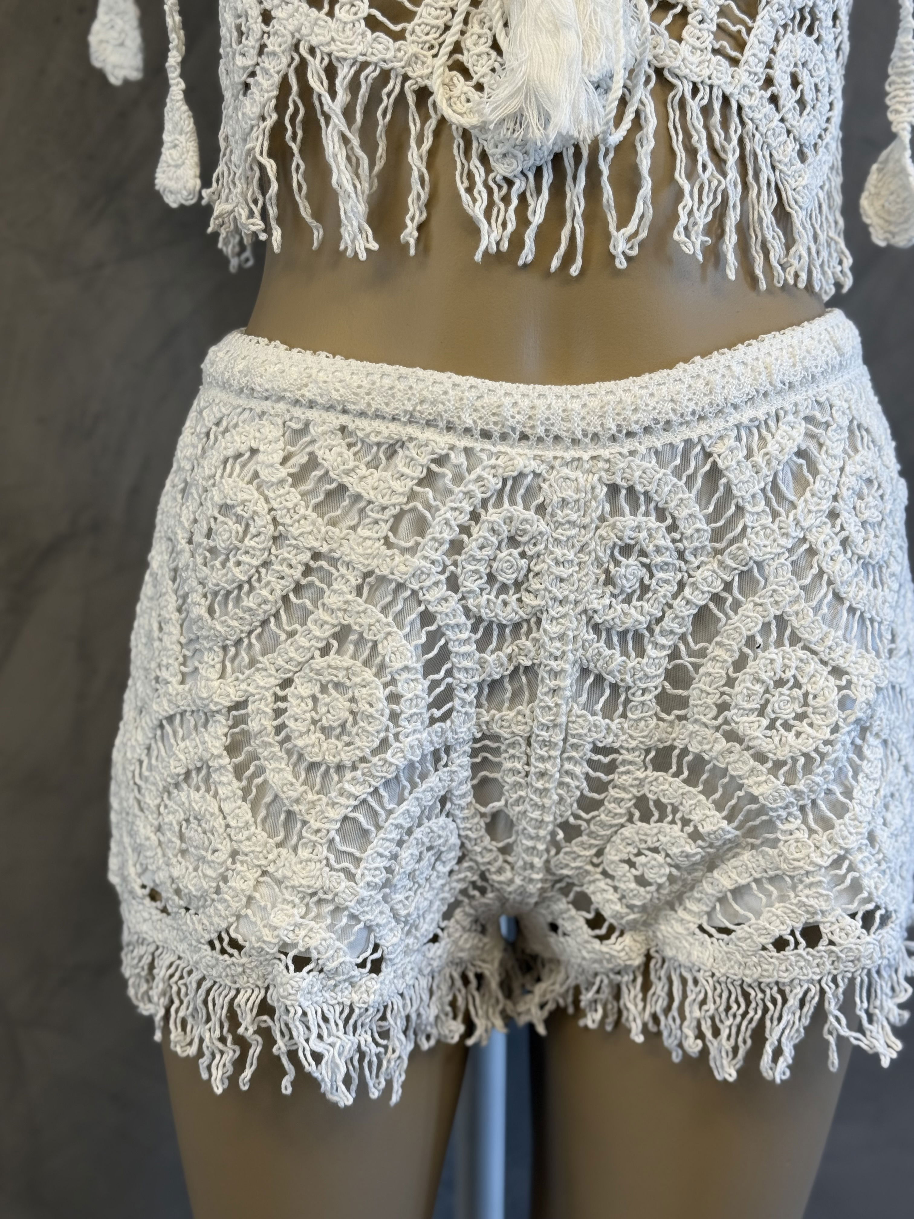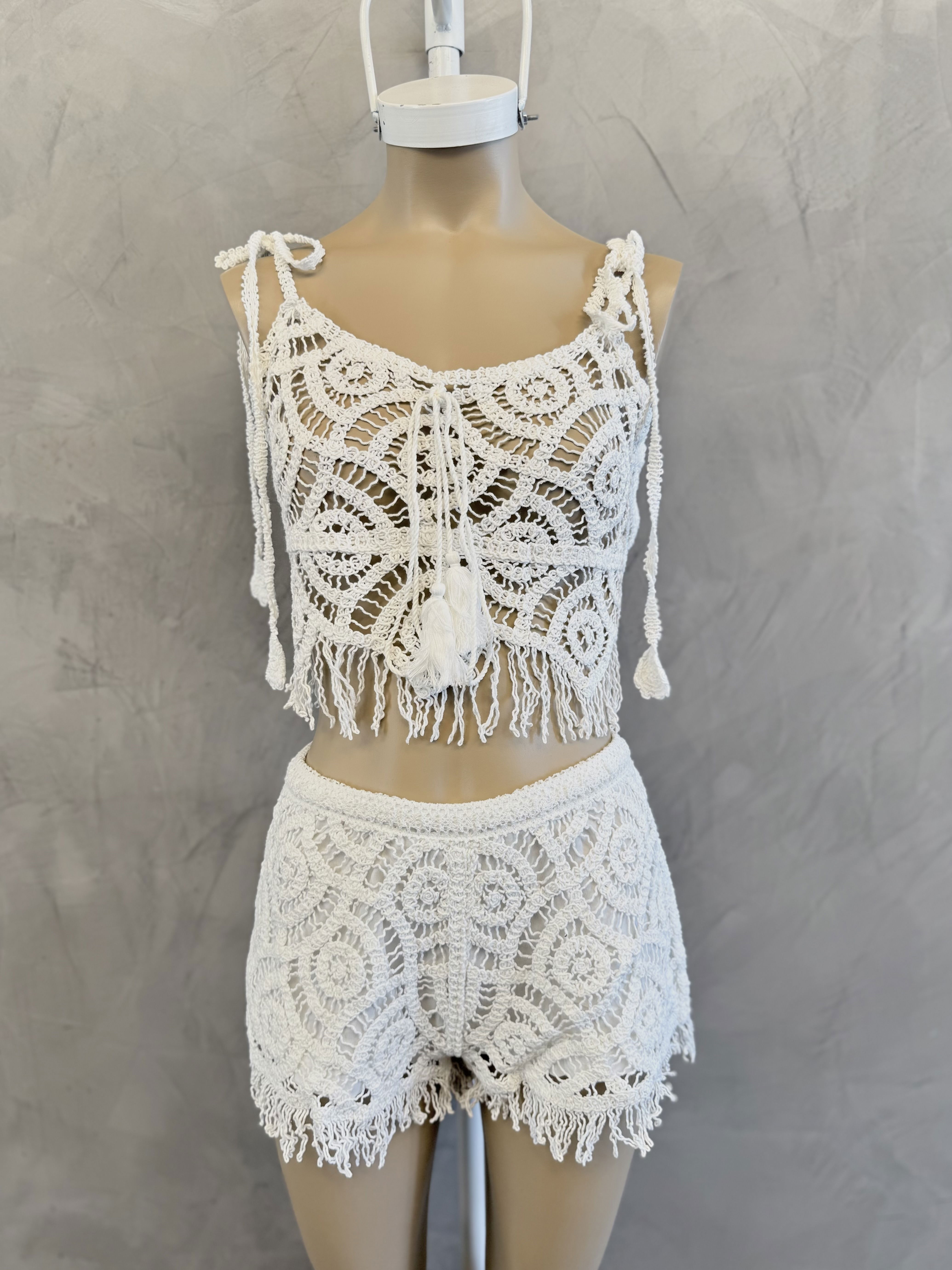 Conjunto tela broderie. Incluye SHORT & TOP. El top tiene tiras en el hombro para atar y regular a medida. Producto importado.