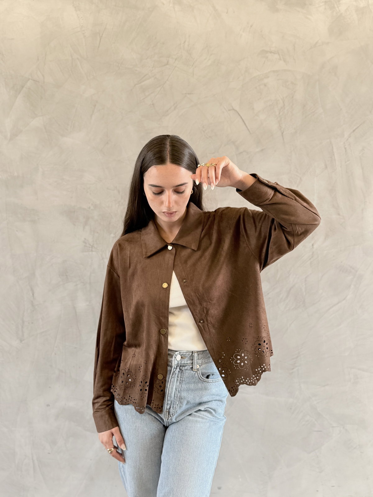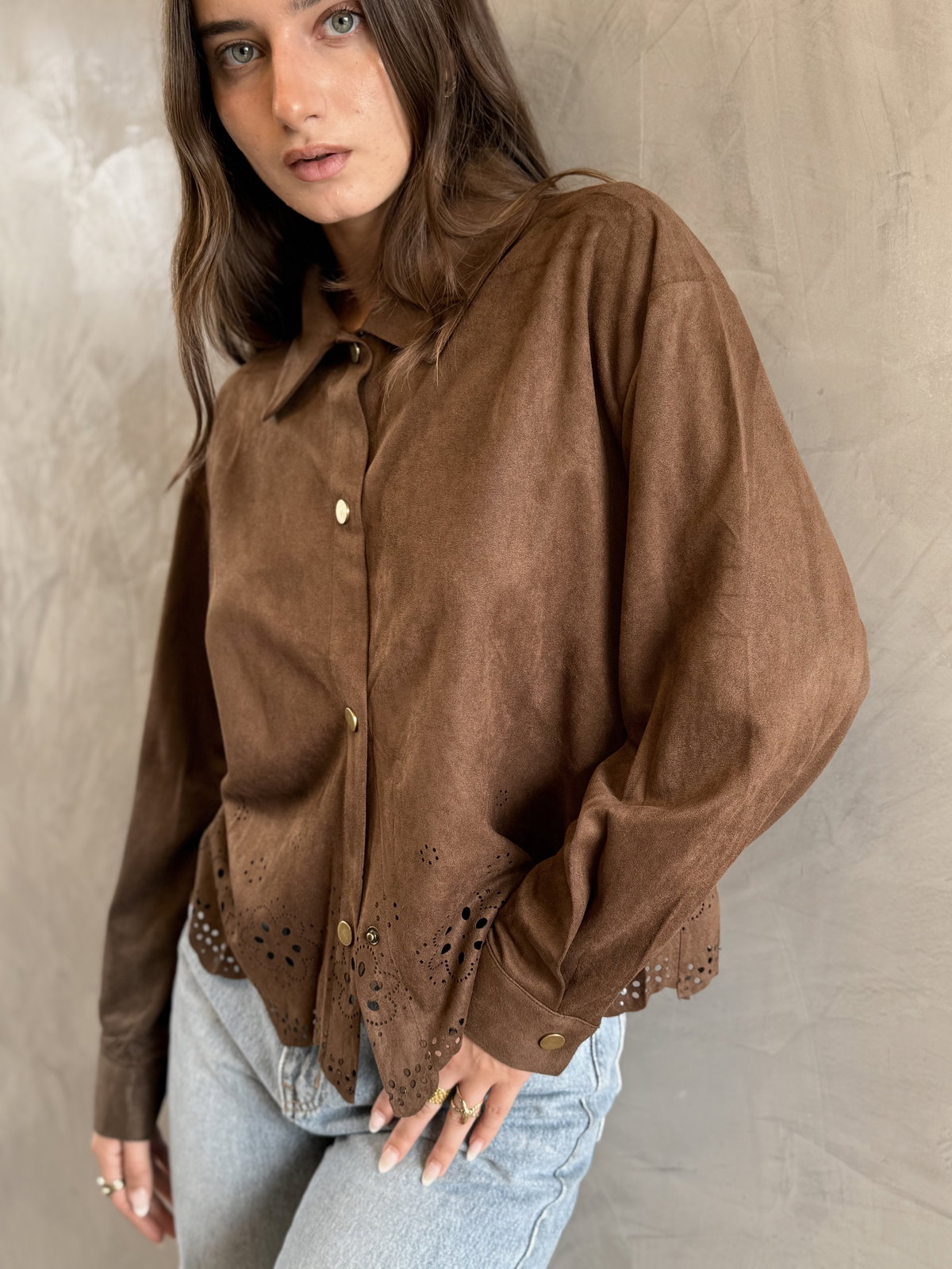 Campera de gamuza, importado. Con botones y detalles de calado en la parte inferior.
