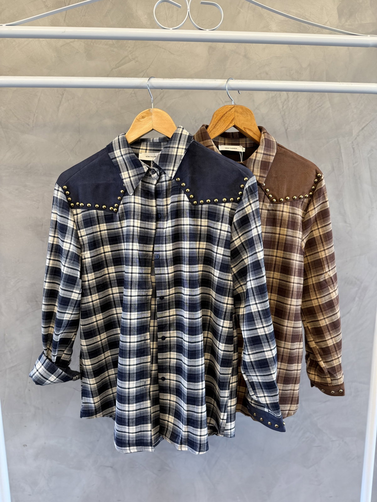 Camisa / Camisaco cuadrille. Con detalles de gamuza en las mangas y cuello. Cuenta con tachas doradas en parte de manga y hombro.