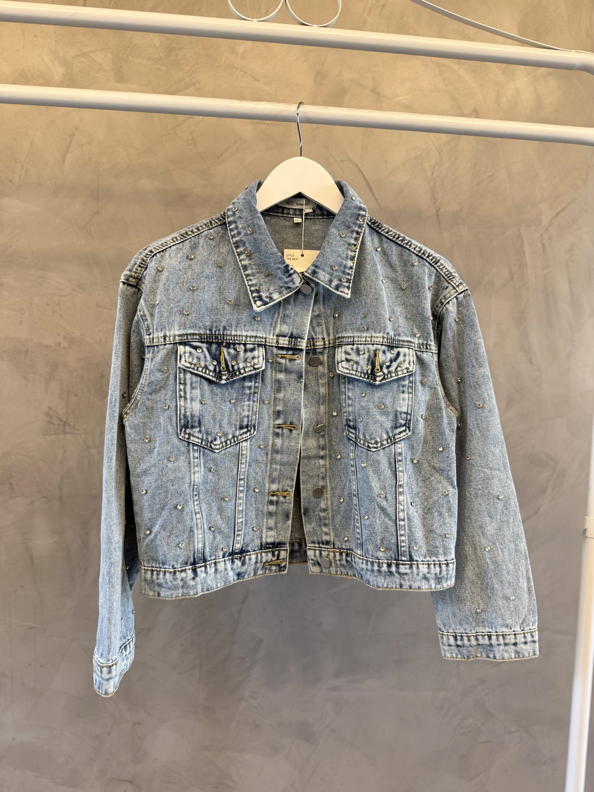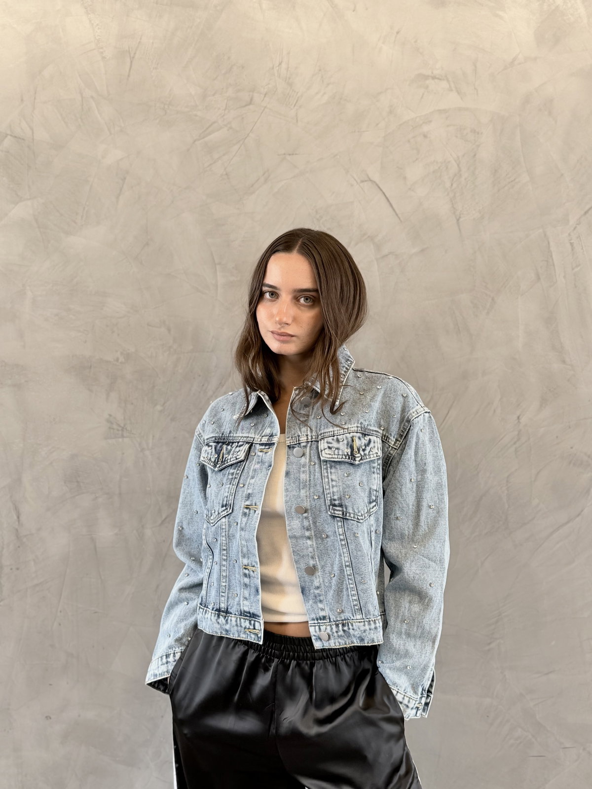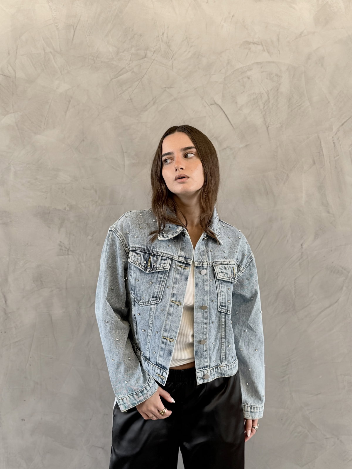 Campera de jean corte oversize, estilo crop. Con strass tejidos. Calidad importado.