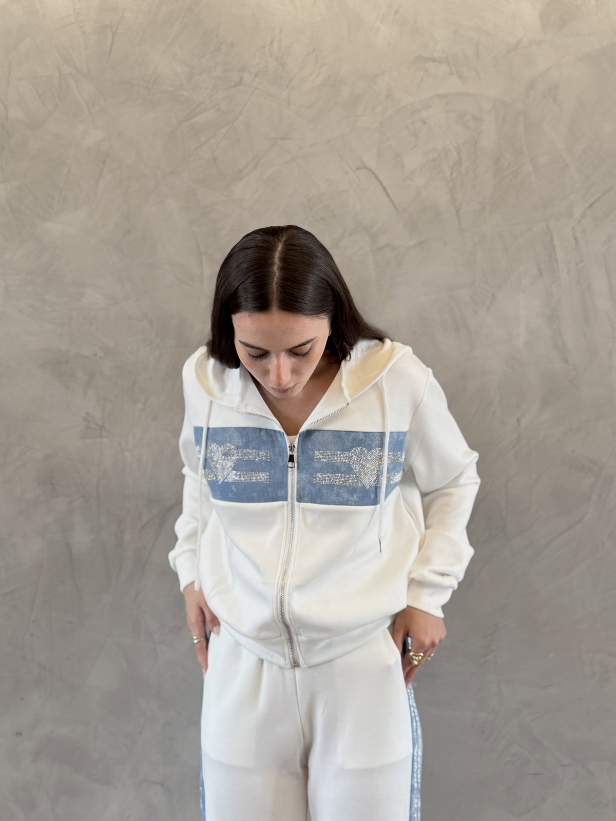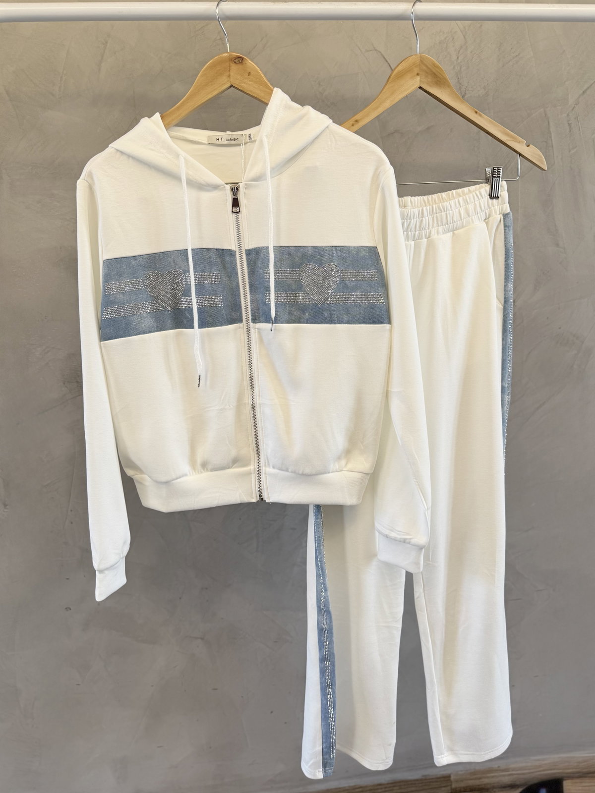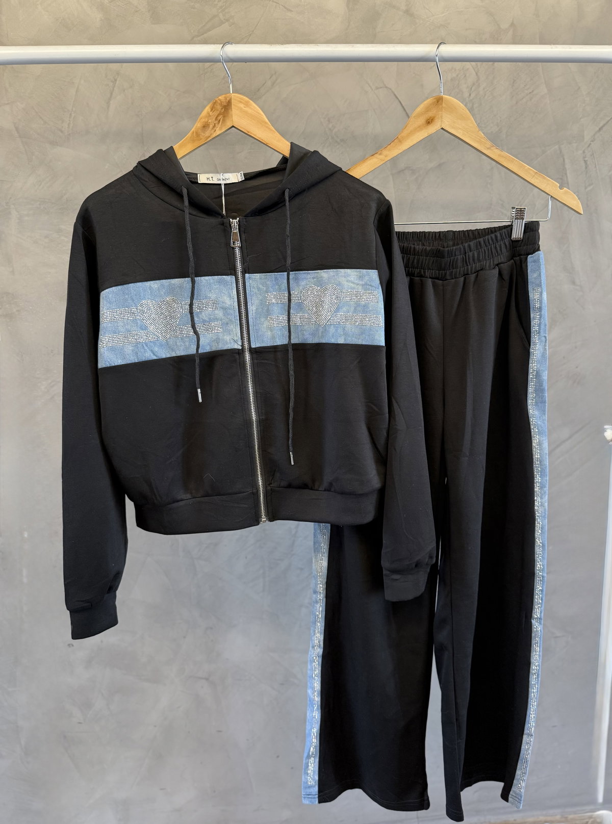 Conjunto pantalon & campera con cierre. Detalles en jean combinado con strass. Calidad importado.