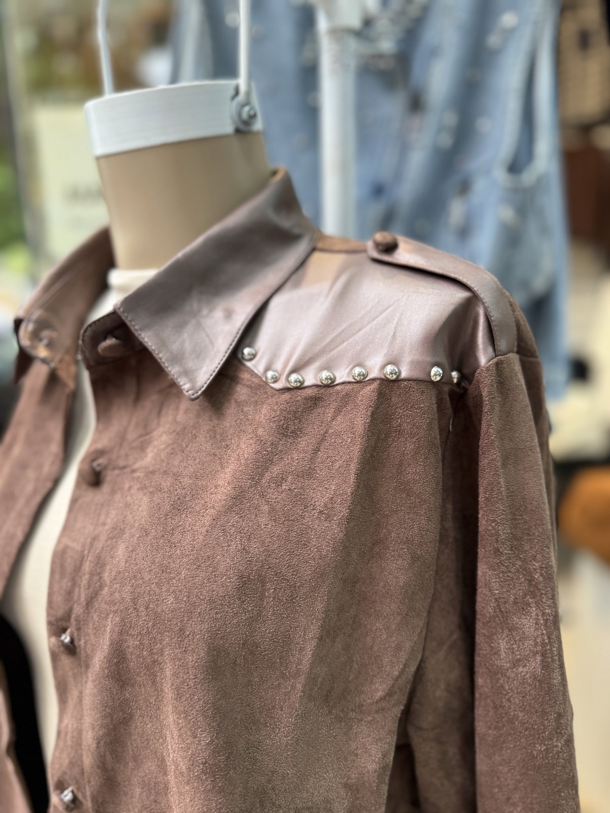 Camisaco de gamuza combinado con cuero con tachas. IMPORTADO