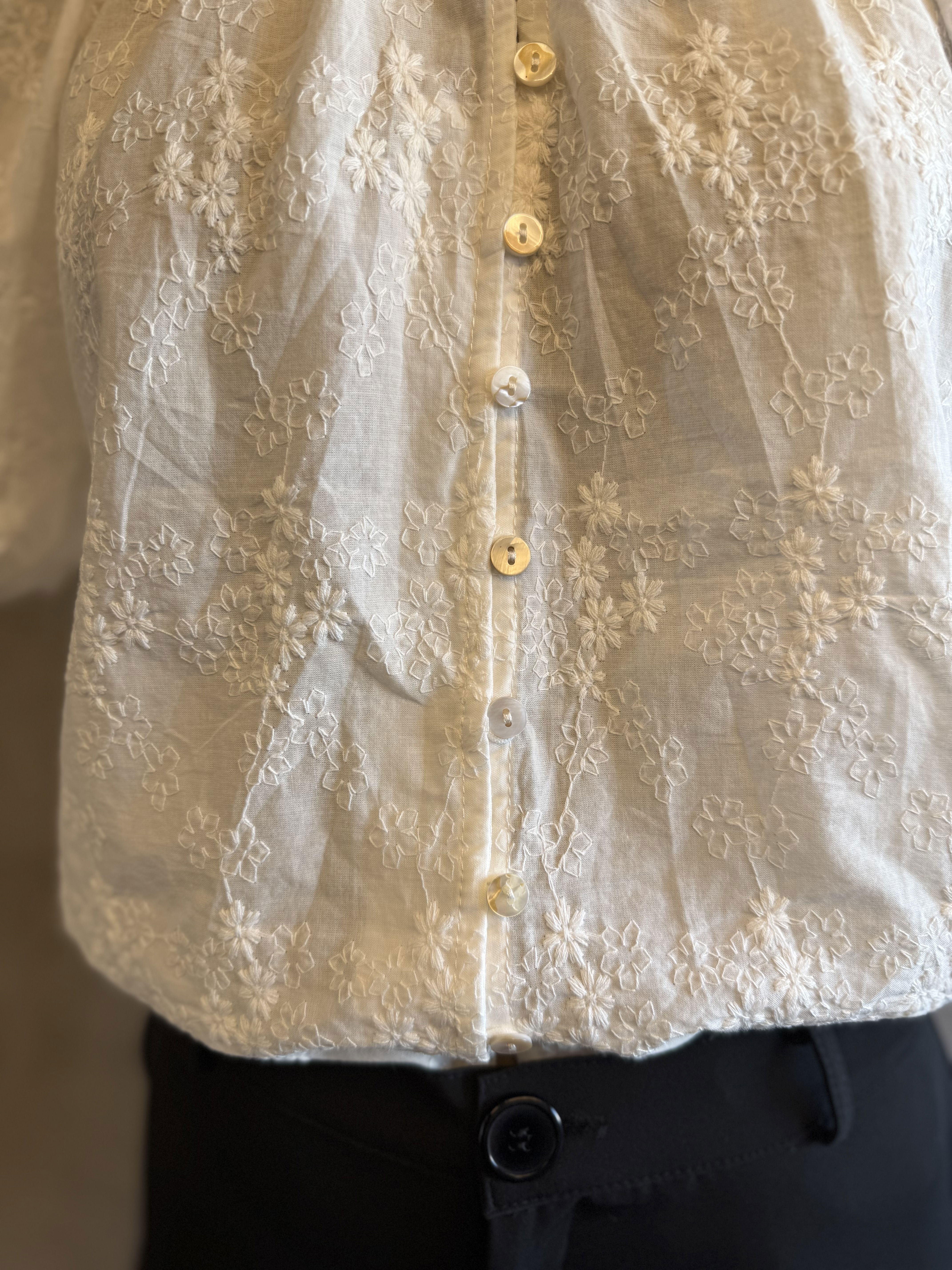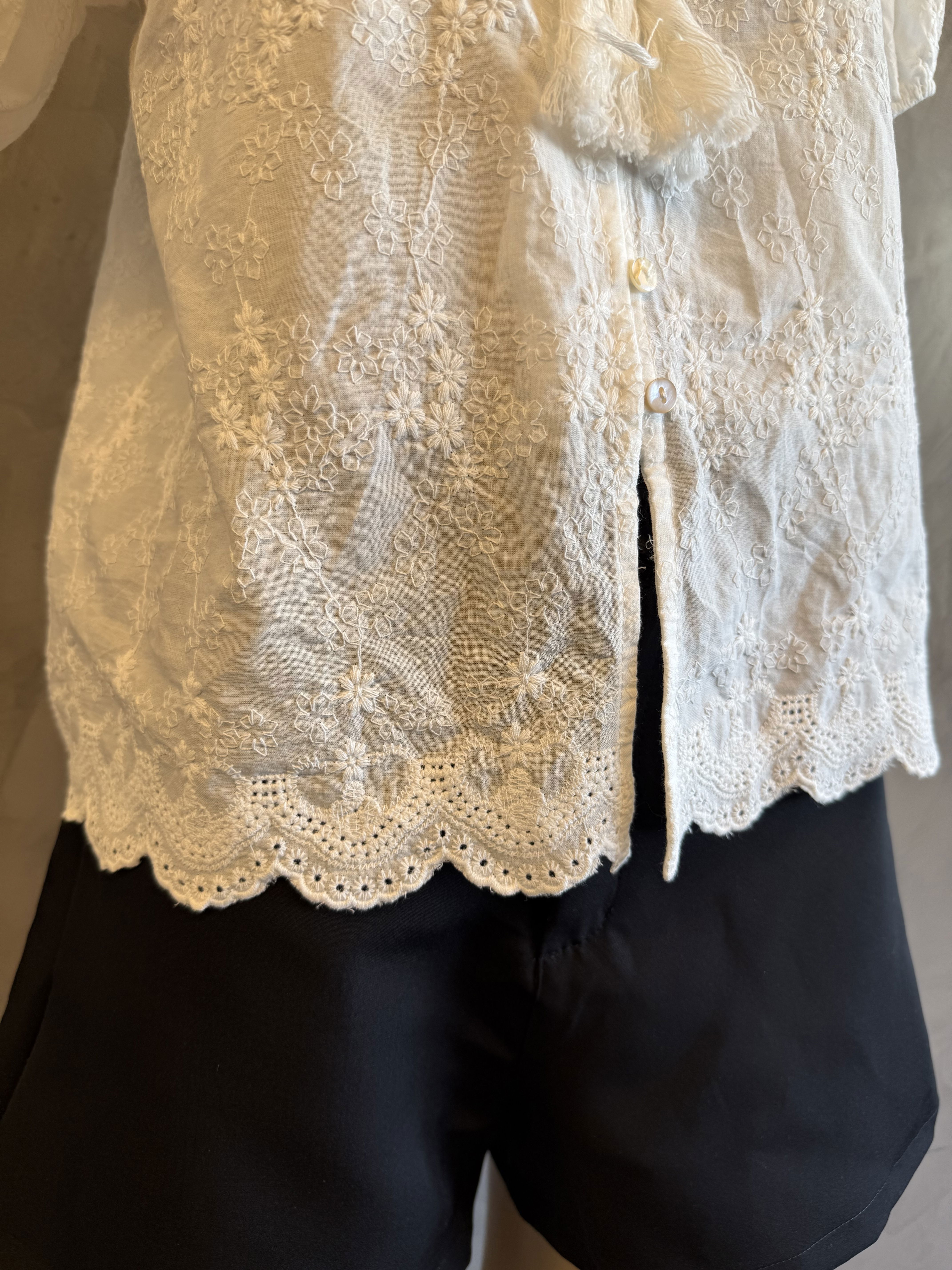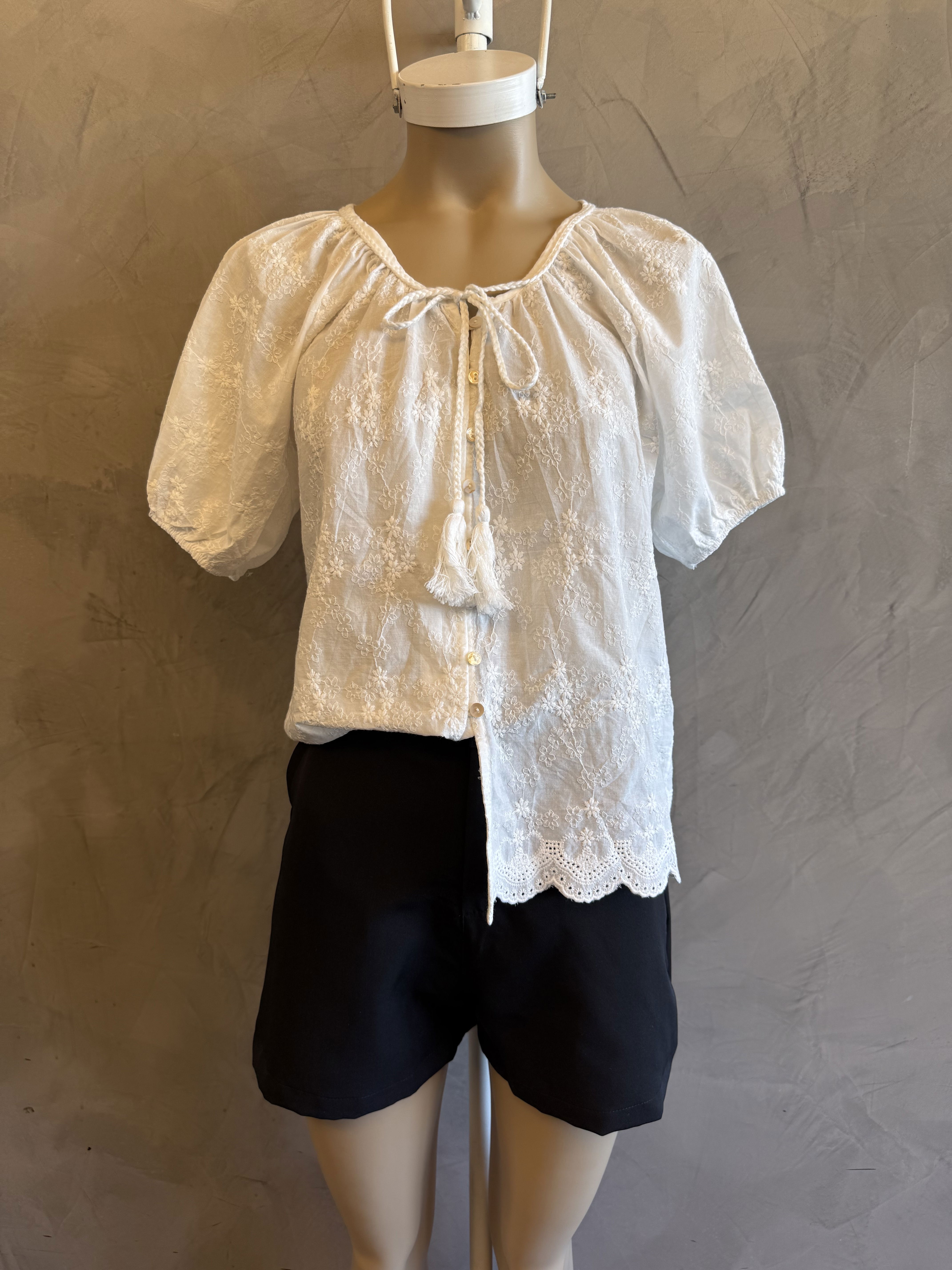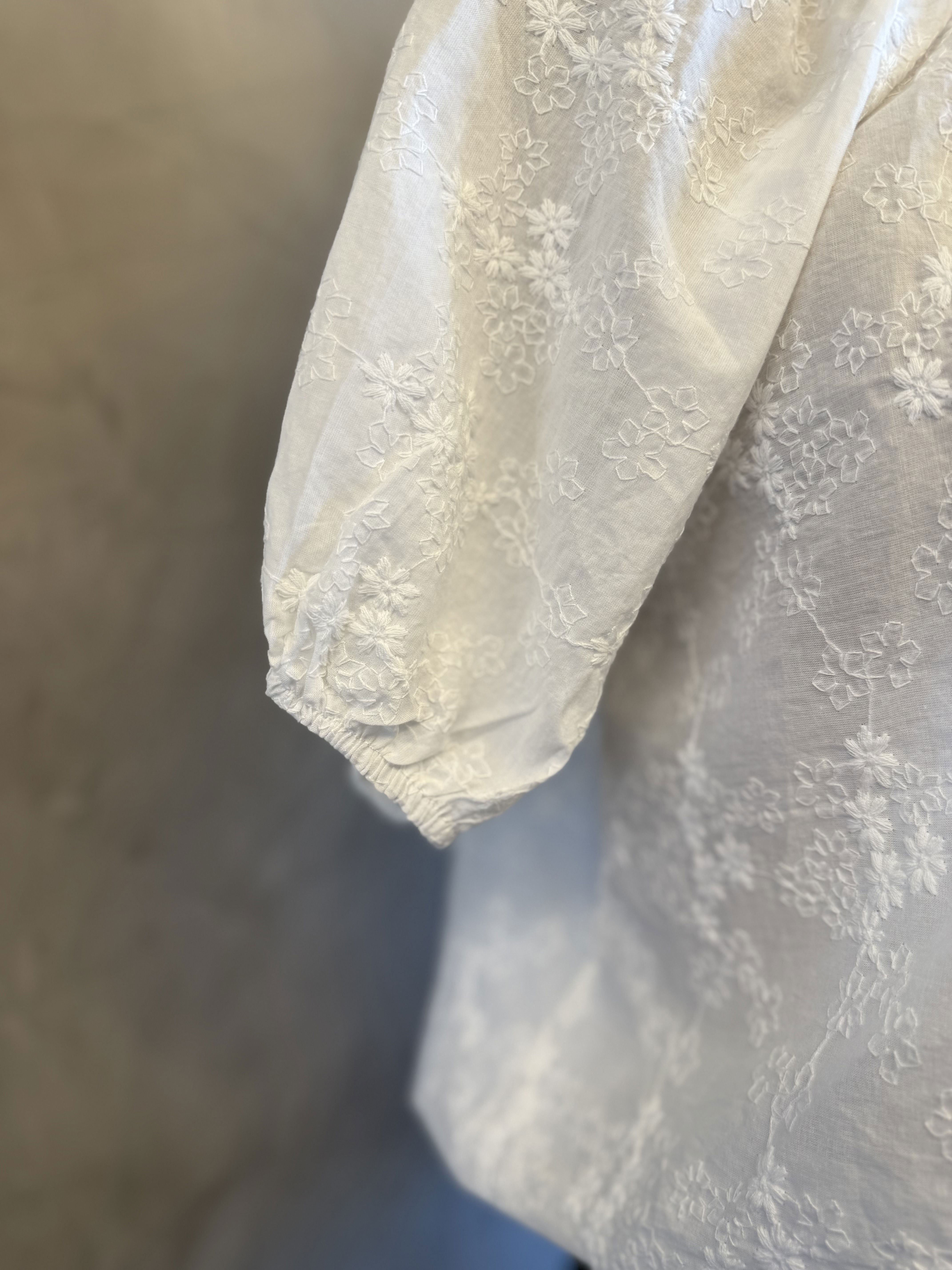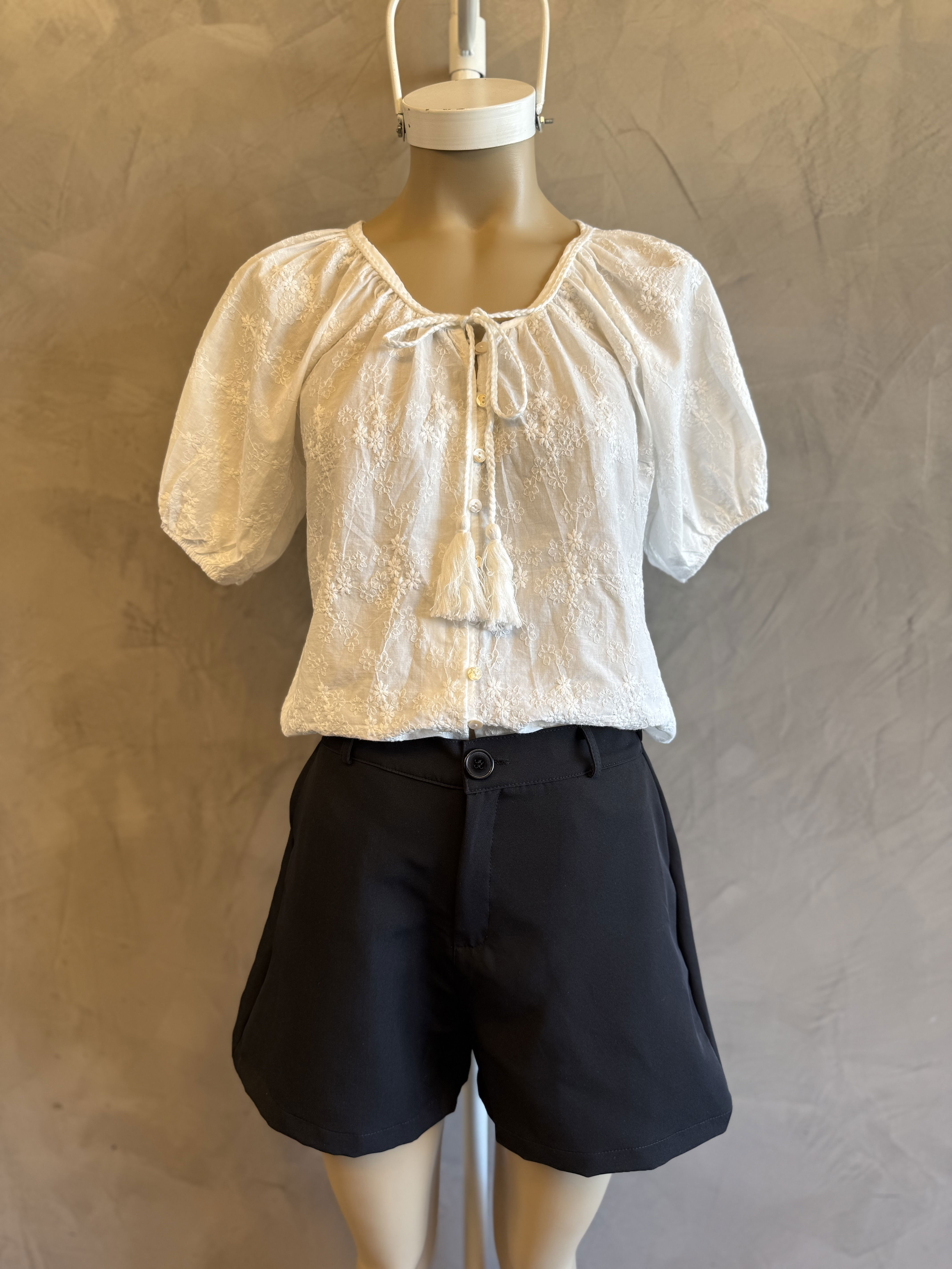 Blusa de tela de algodón broderie, diseñada con un delicado bordado de flores que añade un toque romántico a tu atuendo. Las mangas con detalle de elástico garantizan comodidad y un ajuste perfecto, mientras que las tiritas trenzadas en el cuello permiten un estilo versátil que puedes atar a tu gusto.