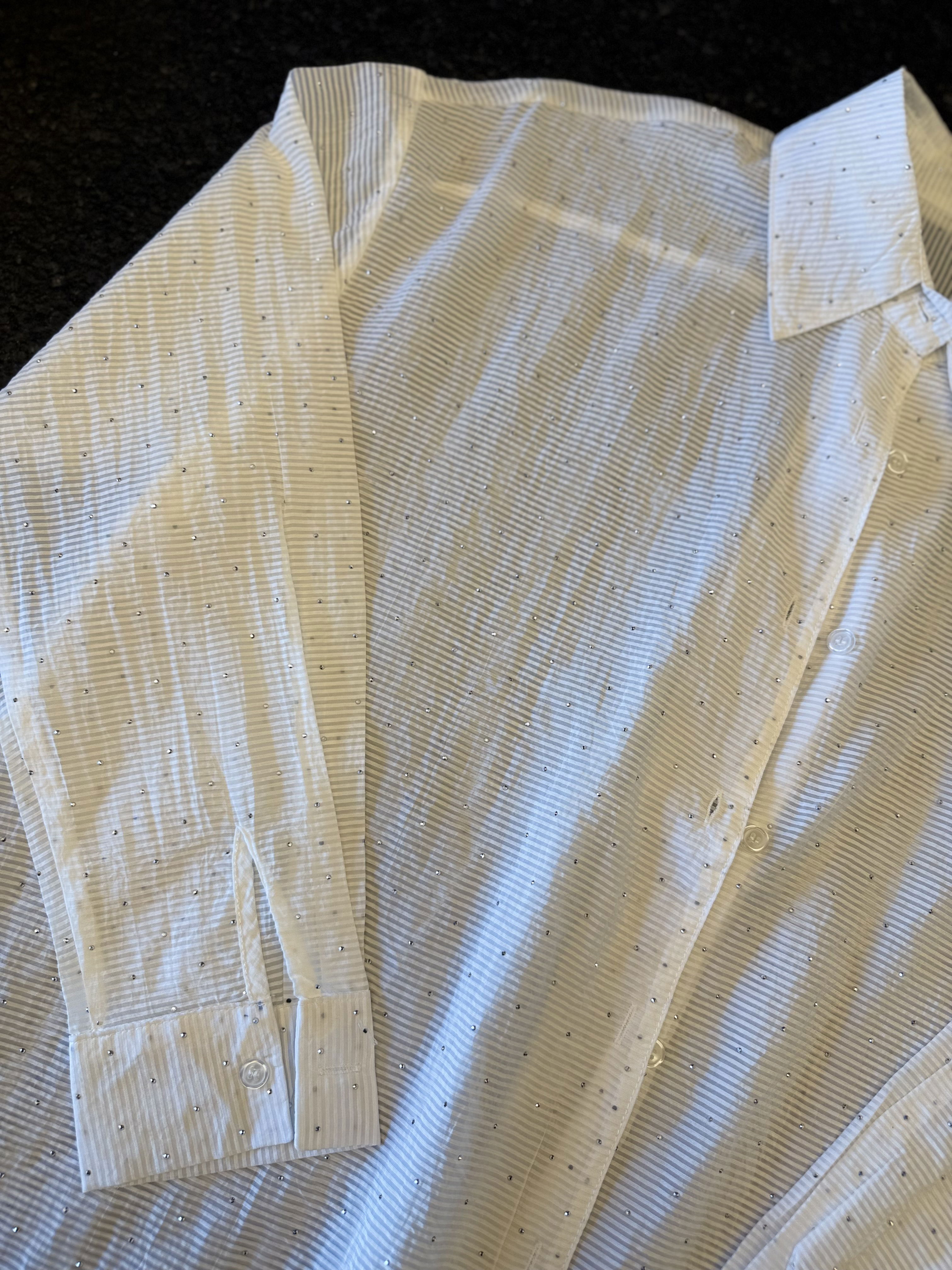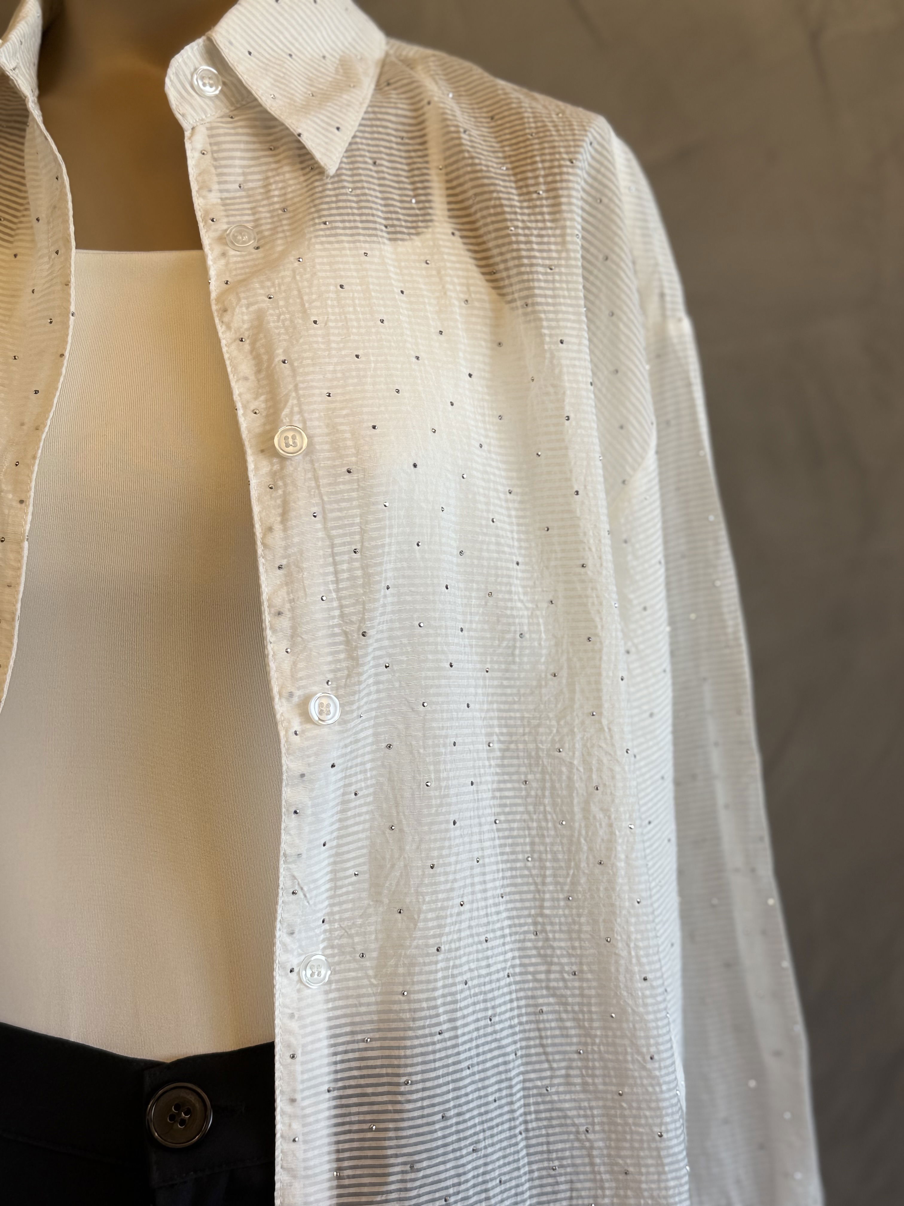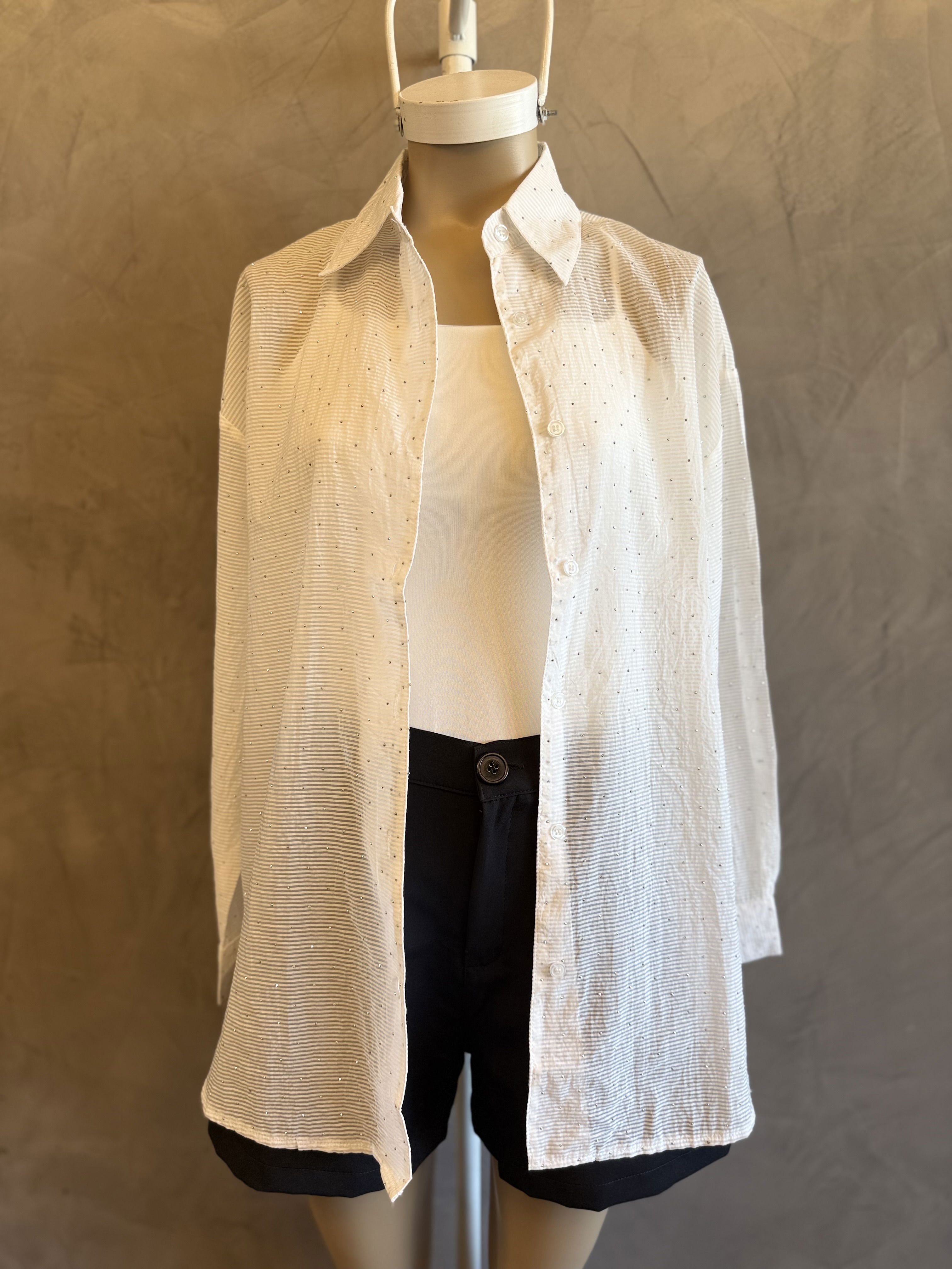 Camisa importada, de tela plana transparente, diseñada para destacar en cualquier ocasión. Con un sofisticado detalle de strass, esta prenda oversize presenta un corte largo en la parte posterior y corto en la delantera, ofreciendo un look moderno y desenfadado. Las mangas caídas añaden un toque de comodidad y fluidez