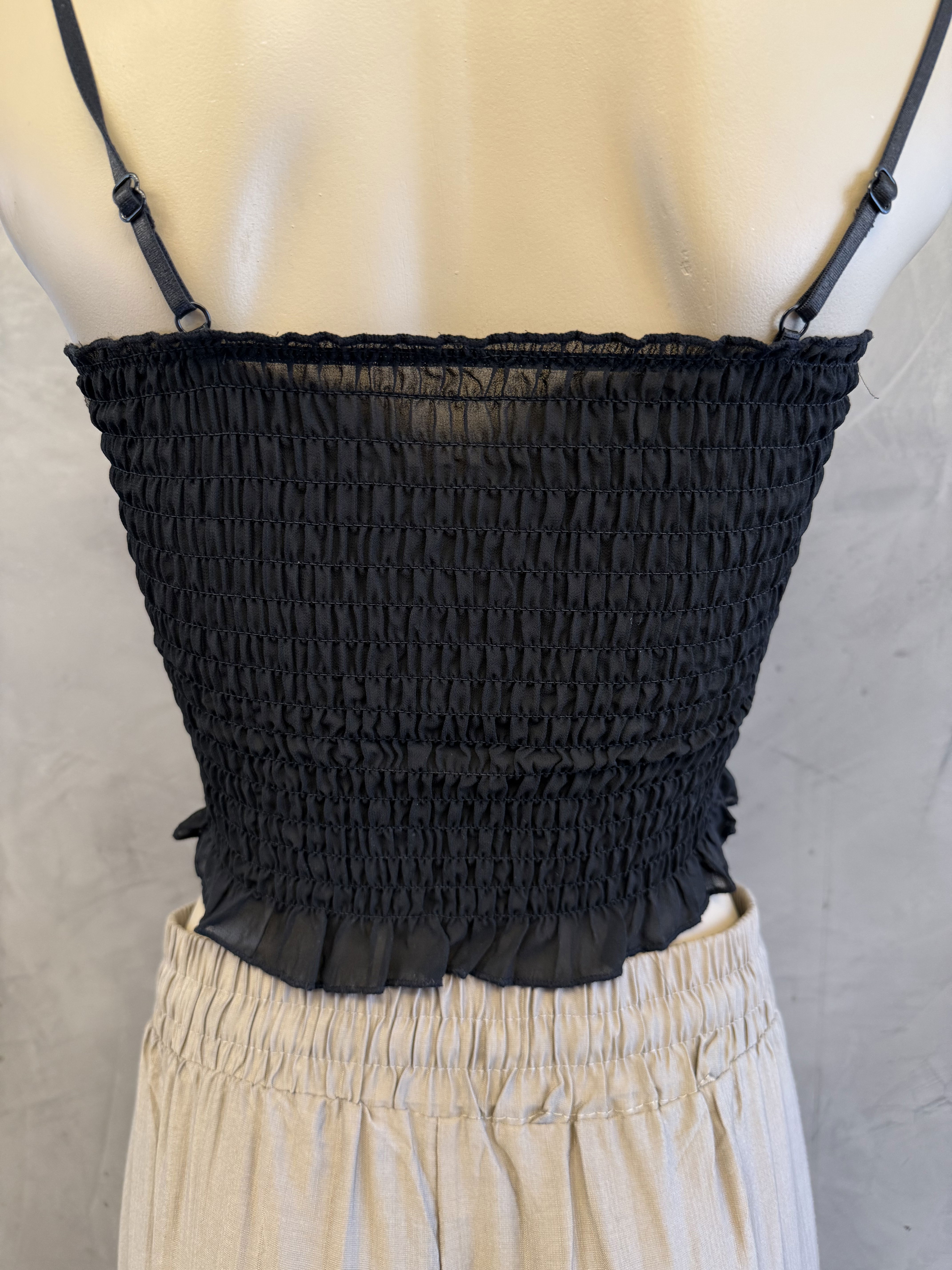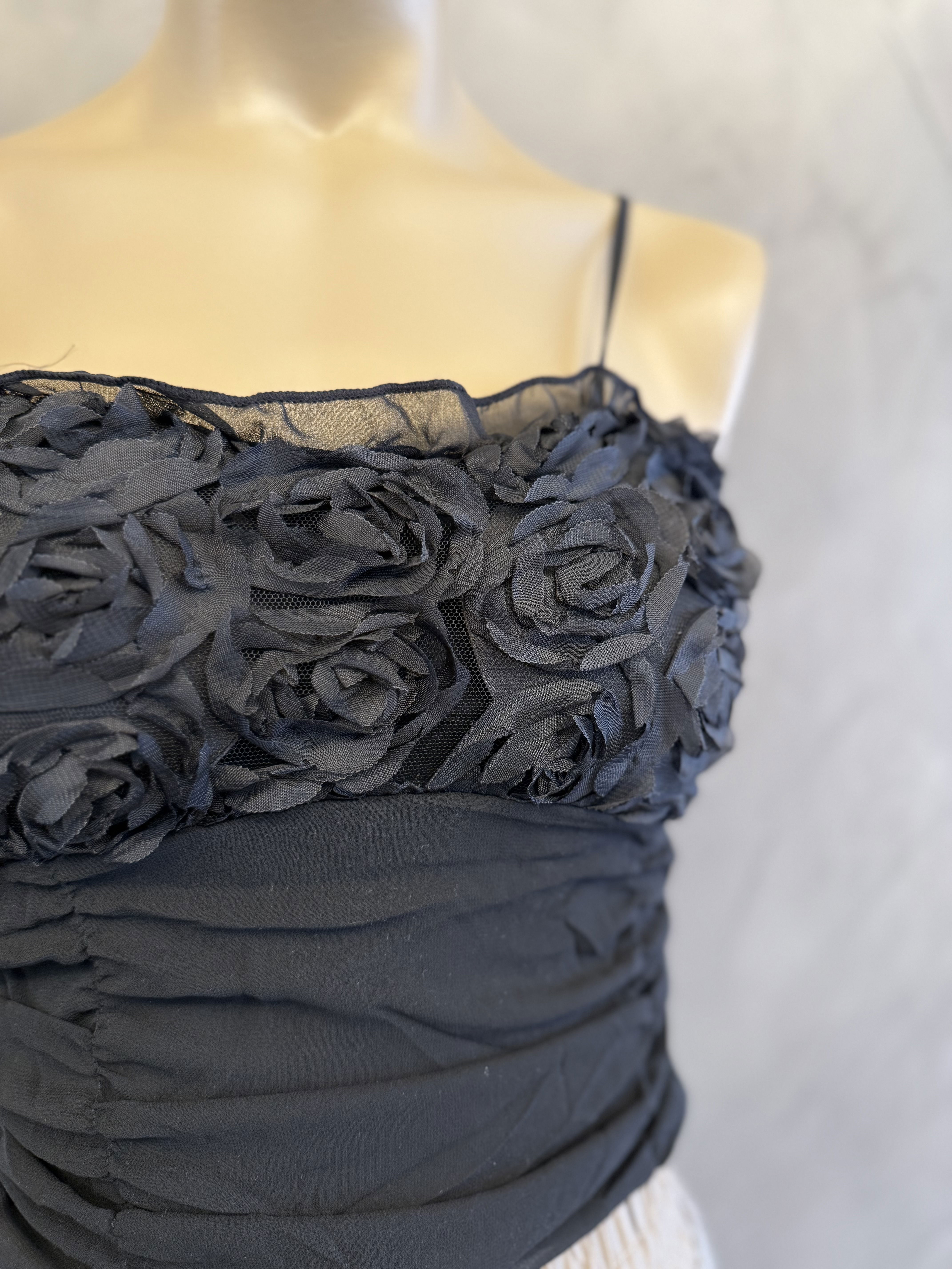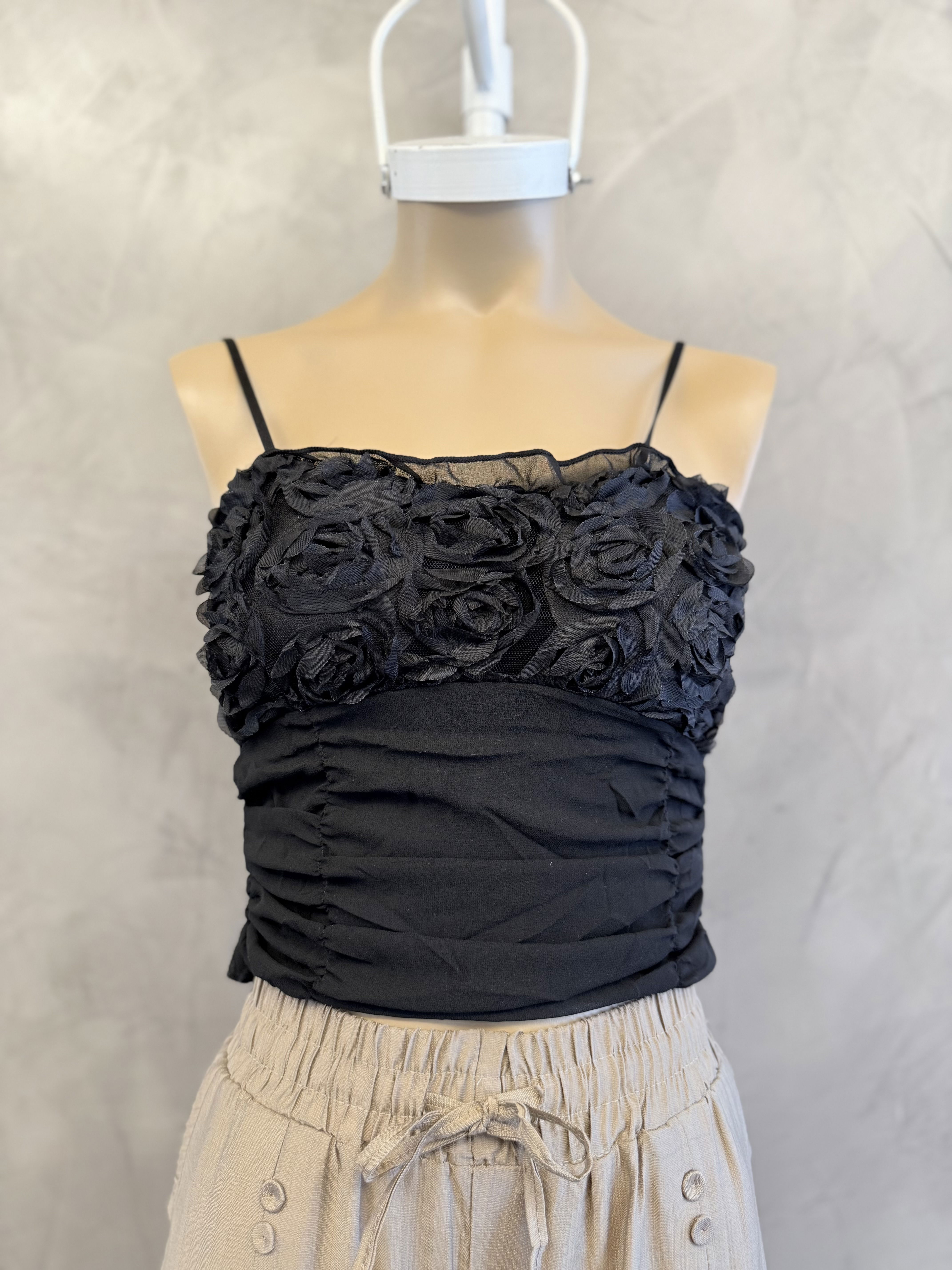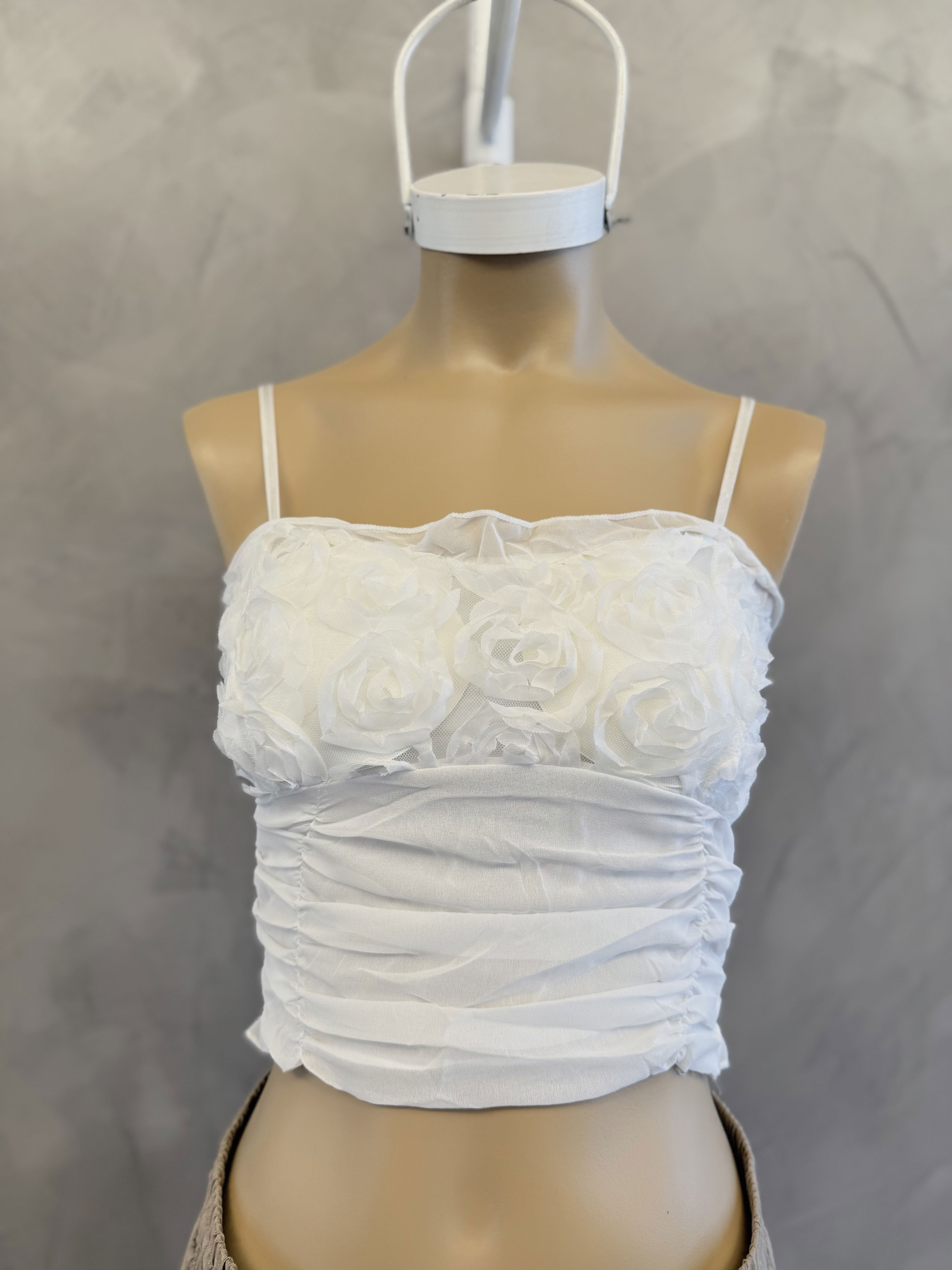 Top con detalles de flores. Cuenta con elastico y tira para regular
