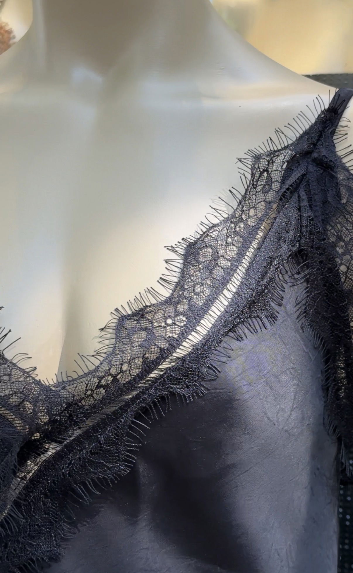 Vestido lencero, tela tipo saten. Con tajo y detalles puntilla