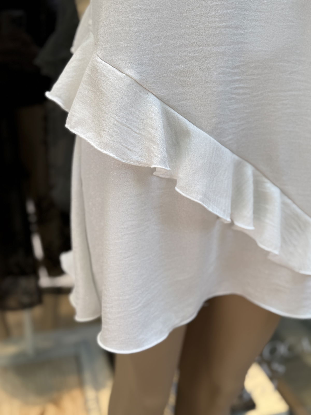 Vestido de tela cey con brillo, con detalles volados. Calidad premium.