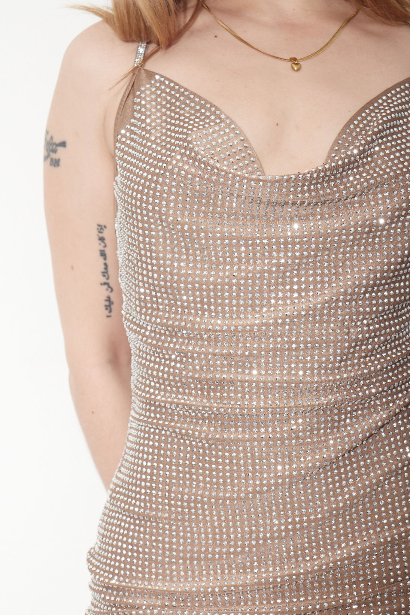 Vestido corto de tela elastizada, diseñado para realzar tu figura. Con un sofisticado cuello buche y tiras ajustables adornadas con strass